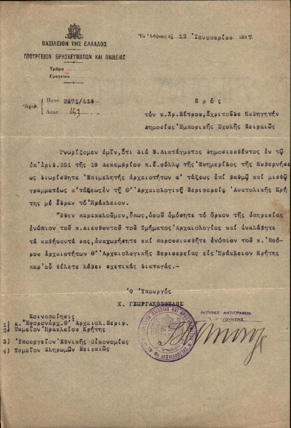 Περιγραφή: Ανακοίνωση ανάληψης καθηκόντων επιμελητή αρχαιοτήτων (pdf) Ξεφύλλισμα pdf