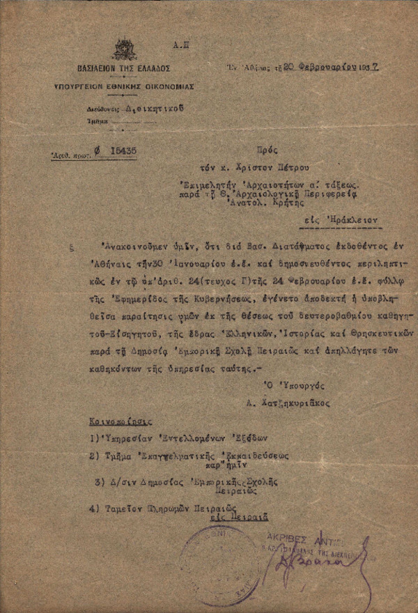 Επιστολή Α. Χατζηκυριάκου (Υπουργού Εθνικής Οικονομίας) προς τον Χρ. Πέτρου με θέμα "Αποδοχή παραίτησης" [1937-02-20]