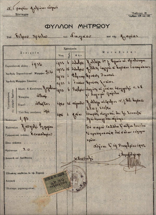 Φύλλο στρατολογικού μητρώου Χ. Πέτρου