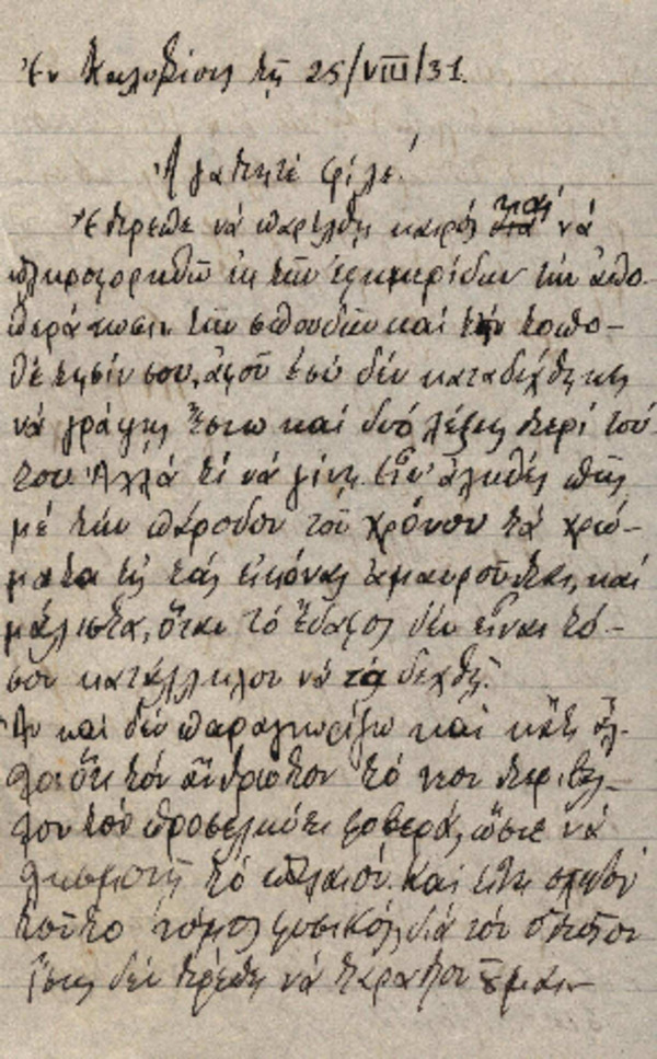 Επιστολή Χ. Πέτρου-Μεσογείτη προς φίλο του με θέμα "Συγχαρητήρια για την επαγγελματική αποκατατάσταση"