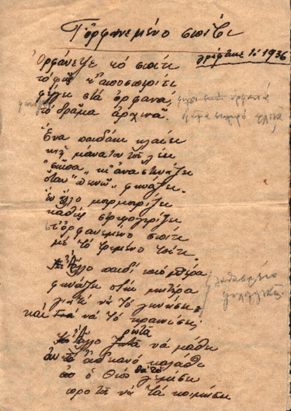 Χειρόγραφο ποίημα της Θάλειας Καλλιγιάννη με τίτλο "Τ' ορφανεμένο σπίτι" [1938-04-27]