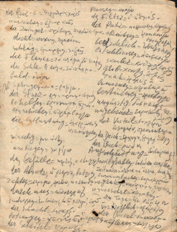 Σημειώσεις Χ. Πέτρου-Μεσογείτη που περιλαμβάνουν μετάφραση γερμανικών λέξεων στα ελληνικά (1)