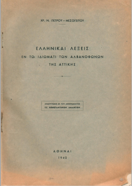 Πέτρου - Μεσογείτης, Χρίστος Ν. (1909-1944) [Συγγραφέας]. Ελληνικαί λέξεις εν τω ιδιώματι των αλβανόφωνων της Αττικής