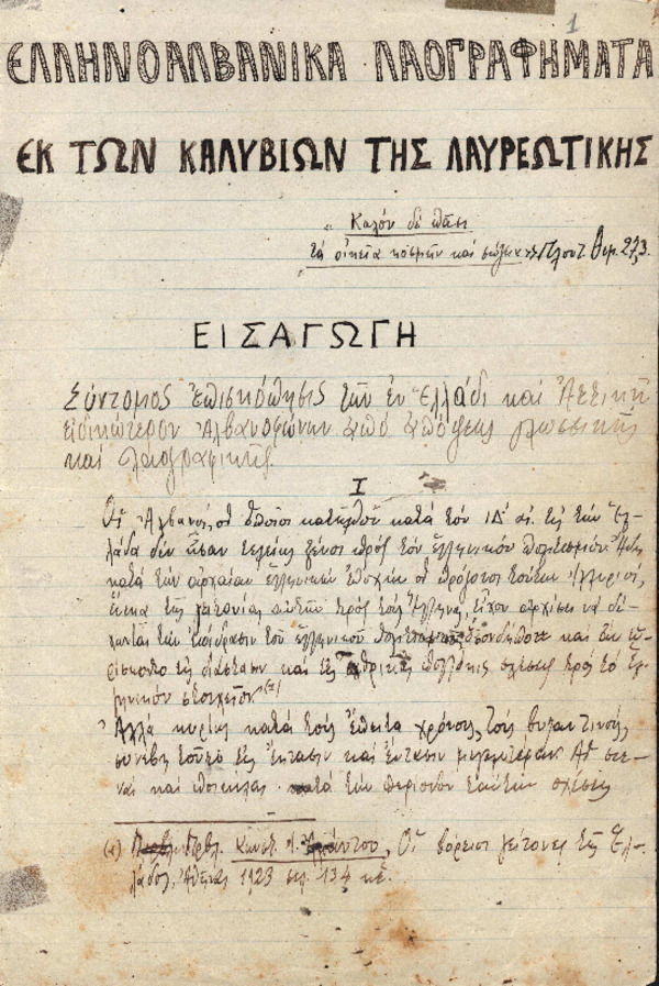 - Ελληνοαλβανικά λαογραφήματα εκ των Καλυβίων της Λαυρεωτικής - Εισαγωγή