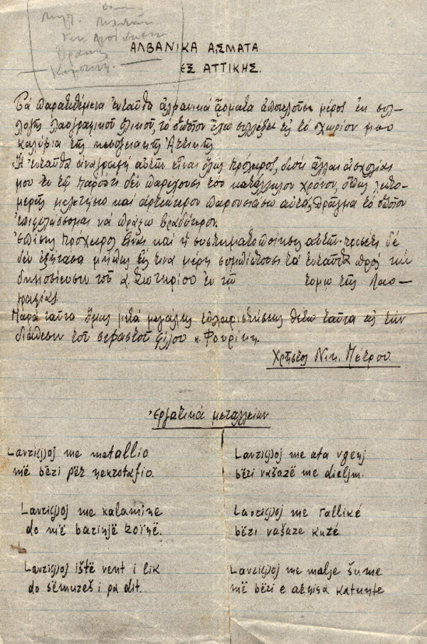 Σημειώσεις μελέτης Χ. Πέτρου-Μεσογείτη με θέμα "Αλβανικά άσματα εξ Αττικής"
