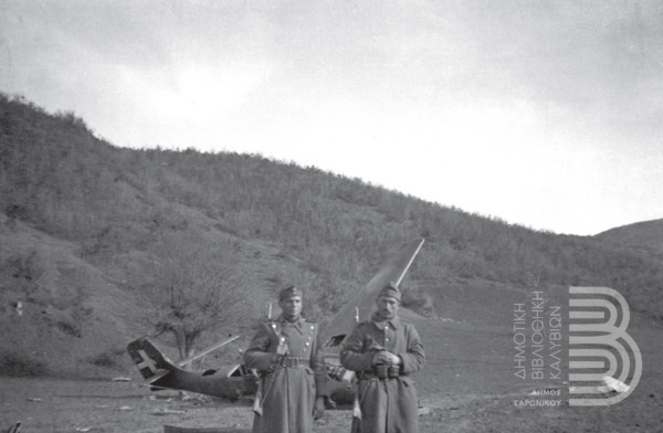 Φωτογραφία με τίτλο "Ο Χρίστος Ν. Πέτρου-Μεσογείτης με τον Ζήκο προ του καταρριφθέντος ιταλικού αεροπλάνου"