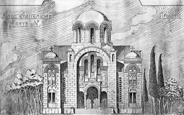- Η πρόσοψη του ναού του Ευαγγελισμού της Θεοτόκου στο αρχικό σχέδιο του Α.Κ. Ορλάνδου