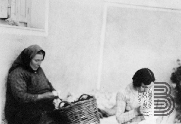 Φωτογραφία με την μητέρα, Μαρία Πέτρου, (που) ετοιμάζει μαλλί για γνέσιμο και την κόρη της Αικατερίνη (που) κεντάει