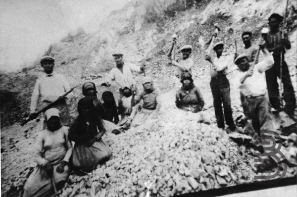 - Φωτογραφία με Καλυβιώτες εργάτες και εργάτριες (που) δουλεύουν σε νταμάρι