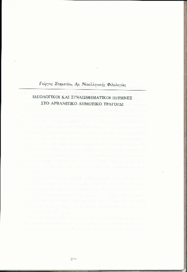 Σταματίου, Γιώργος Π. (1937-2013) [Συγγραφέας]. Ιδεολογικοί και συναισθηματικοί πυρήνες στο αρβανίτικο δημοτικό τραγούδι