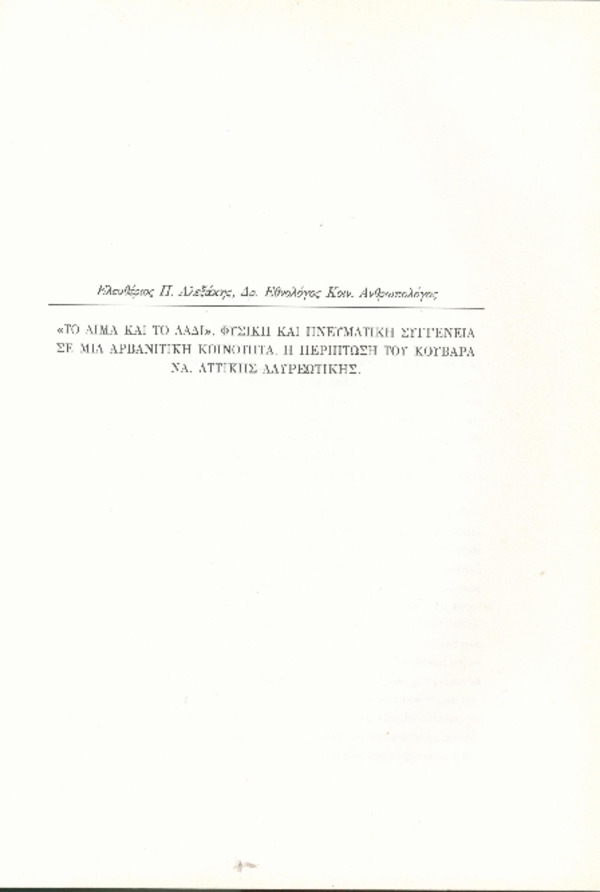 Αλεξάκης, Ελευθέριος Παν. (1944-....) [Συγγραφέας]. "Το αίμα και το λάδι". Φυσική και πνευματική συγγένεια σε μια αρβανίτικη κοινότητα. Η περίπτωση του Κουβαρά ΝΑ. Αττικής - Λαυρεωτικής