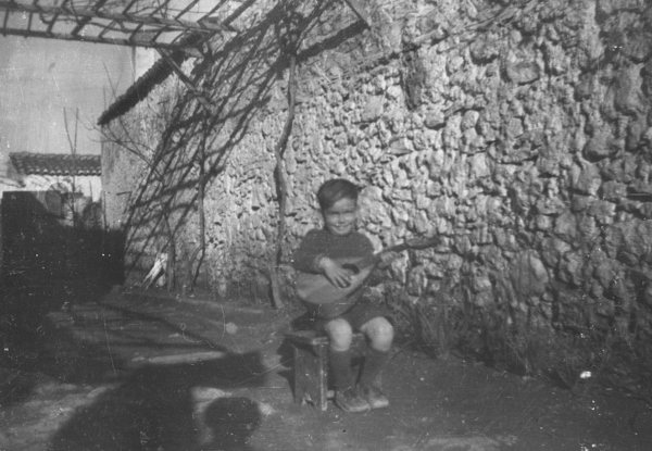 - Ψηφιοποιημένη Αρνητικό: Φωτογραφία με αγοράκι στην αυλή του σπιτιού του να παίζει μουσικό όργανο