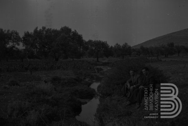 - Ψηφιοποιημένη Αρνητικό: Φωτογραφία παρέας αντρών στο ρέμα Αγ. Γεωργίου, στο βάθος διακρίνεται η Μερέντα