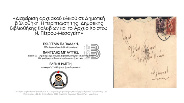 Παπαδάκη, Ευαγγελία (1980-....) [Συγγραφέας]. Διαχείριση αρχειακού υλικού σε Δημοτική βιβλιοθήκη. Η περίπτωση της Δημοτικής Βιβλιοθήκης Καλυβίων και το Αρχείο Χρίστου Ν. Πέτρου-Μεσογείτη