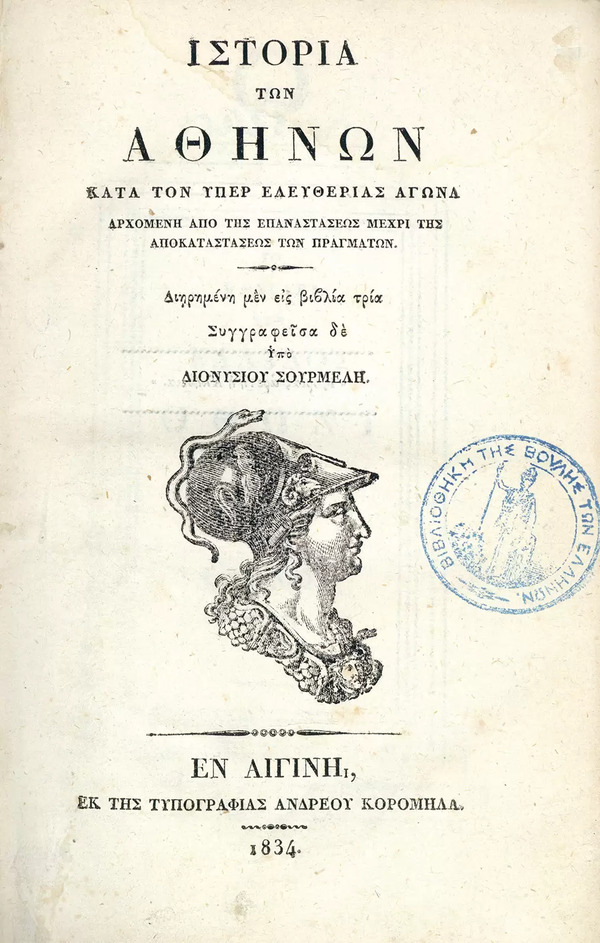 Σουρμελής, Διονύσιος (17..;-186.;) [Συγγραφέας]. Ιστορία των Αθηνών κατά τον υπέρ της ελευθερίας αγώνα αρχομένη από της Επαναστάσεως μέχρι της αποκαταστάσεως των πραγμάτων