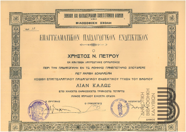 Πτυχίο Παιδαγωγικής του Χρήστου Ν. Πέτρου Μεσογείτη [1934-04-28]