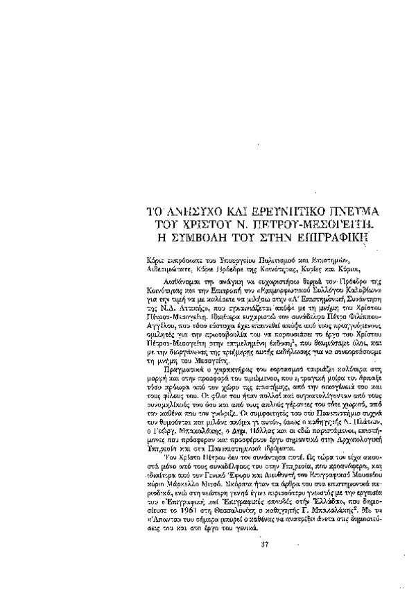 Ψηφιοποιημένο Έγγραφο: Το ανήσυχο και ερευνητικό πνεύμα του Χρίστου Ν. Πέτρου - Μεσογείτη. Η συμβολή του στην επιγραφική