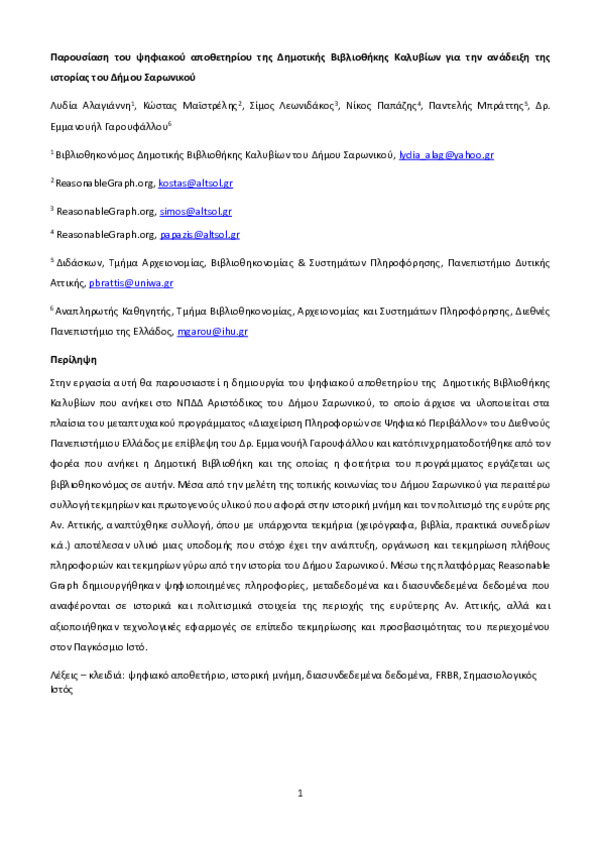 Παρουσίαση του ψηφιακού αποθετηρίου της Δημοτικής Βιβλιοθήκης Καλυβίων για την ανάδειξη της ιστορίας του Δήμου Σαρωνικού
