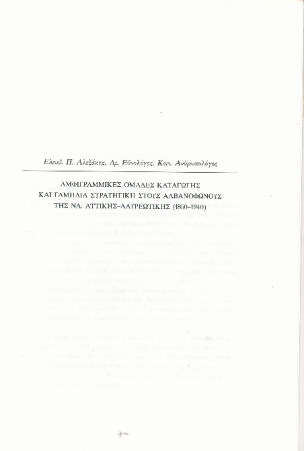 Αλεξάκης, Ελευθέριος Παν. Αμφιγραμμικές oμάδες καταγωγής και γαμήλια στρατηγική στους αλβανόφωνους της ΝΑ. Αττικής – Λαυρεωτικής (1850-1940)