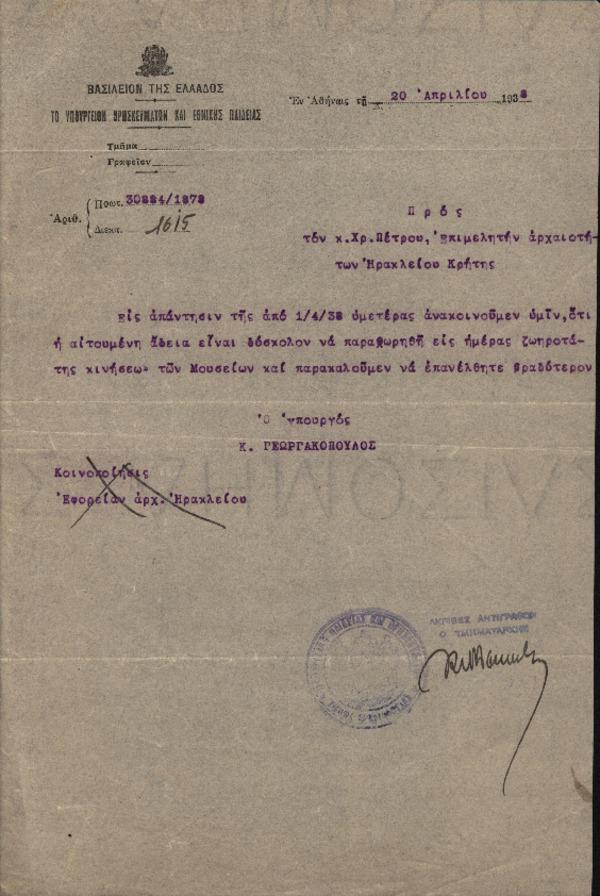 Part of the: Υπηρεσιακή αλληλογραφία ως επιμελητής Μουσείου Ηρακλείου
