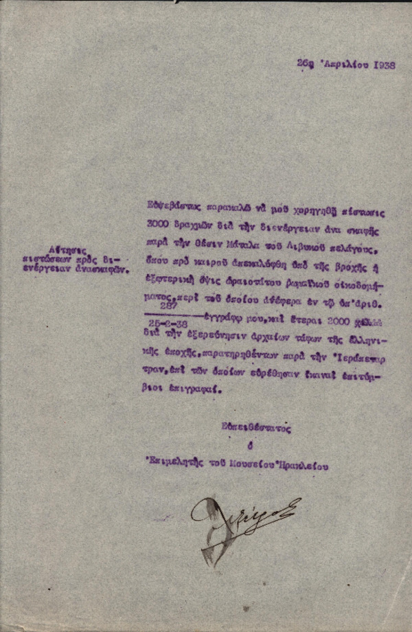 Αίτηση Χ. Πέτρου-Μεσογείτη με θέμα "Αίτησις πιστώσεων προς διενέργειαν ανασκαφών" [1938-04-26]