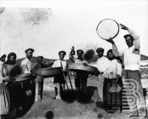 Φωτογραφία με γυναίκες από τα Καλύβια που εργάζονται στην αλωνιστική μηχανή του Συνεταιρισμού